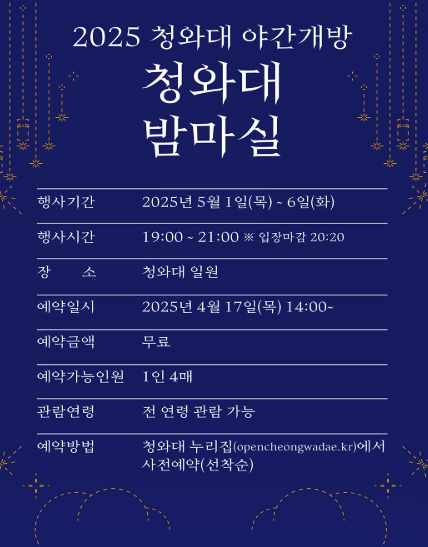청와대는 2025년 5월 야간개장 행사인 악몽의 방에 국민들을 초대합니다. 낮과는 다른 매력을 만나고 싶다면 이 특별한 기회를 놓치지 마세요. 아래에서 행사에 대한 자세한 내용과 참여 방법을 안내해 드리겠습니다.